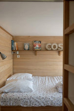 Mi tiny-house mi intérieur de voilier, chaque cabane sur l'eau vous offre un point de vue privilégié sur le miroir de l'étang reflétant la nature. Luxe de trinquer dans votre jacuzzi à 38 degrés, au-dessus de l’eau, face à la prairie et sous un ciel étoilé. À l’intérieur, vous trouverez une cuisine équipée, une chambre avec un lit double haut façon bateau pour admirer la vue, une petite salle de bain avec douche à l’italienne, un lavabo de cabine, des toilettes séparées et une mezzanine avec deux lits simples, cachette pour les enfants à laquelle ils monteront par un escalier ludique. Un soin tout particulier a été apporté à ces cabanes sur l'eau en éco-construction.