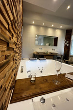 Une salle de bain à la déco scandinave Coulissez la porte et découvrez la salle de bain à la déco scandinave. Rien de mieux pour vous délasser. Imaginez les massages offerts par les dizaines de jets de notre jacuzzi avec une coupe de pétillant pour fêter cette parenthèse en amoureux. Vous pourrez également apprécier les bienfaits d’une douche à effet de pluie.
