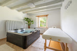 Équipements et confort : Jacuzzi privé installé dans une pièce bien être. Table de massage avec huile à disposition. Cheminée pour la touche de chaleur et de romantisme