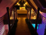 L’accès à cette chambre, située à l’étage, se fait par un charmant ponton fleuri, sublimé par des bougies décoratives. Une entrée pleine de caractère, qui participe à l’expérience du lieu.
