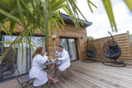 Découvrez une alcôve de bois blanc, décorée de plumes et de peau de mouton, avec jacuzzi et sauna privatifs. La décoration romantique de ce nid douillet est une véritable invitation au bien-être et à la détente.