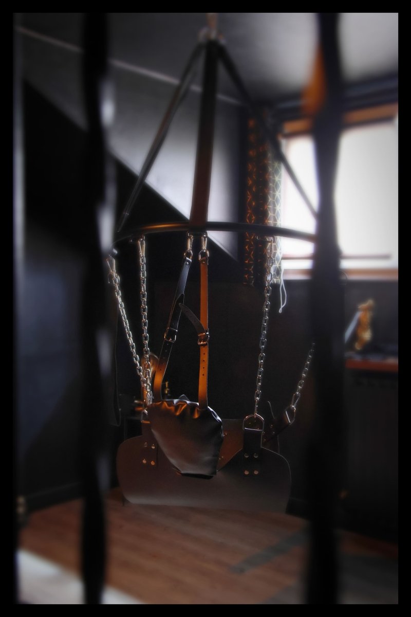 Chambre audacieuse équipée d’une chaise suspendue, d’une croix de Saint-André et d’accessoires, idéale pour pimenter votre séjour