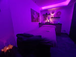 Sauna traditionnel de luxe avec ambiances lumineuses personnalisables.