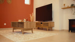 Salon cosy avec canapé, poufs, TV 165 cm, enceinte JBL et cheminée d’ambiance