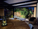 La baie vitrée panoramique s’ouvre sur une terrasse couverte illuminée par des rubans LED personnalisables, créant une atmosphère douce et intime.