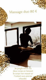 Je vous propose en option des massages relaxants... massage solo tout le corps ( 60€ / 1h ) ou massage duo durant lequel je jongle entre vos deux corps en plaçant le corps non massé sur l'instant sous pierres d'argile chaudes. ( 80h / 1h20 minimum dos arrière des jambes pieds )