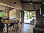 La maison associe avec élégance le charme de la pierre et du bois à une décoration contemporaine, sublimée par des plafonds noirs profonds.
