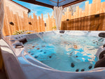 Le jacuzzi est propre, parfaitement fonctionnel et idéalement placé pour profiter d’un moment de détente à deux. Les rideaux nous plonge dans un cocon et nous isole COMPLETEMENT du froid et du vent !