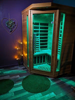 Le sauna infrarouge privatif, avec ses ambiances lumineuses chromothérapeutiques, vous invite à une détente absolue.