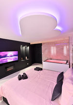Au centre de la pièce, le lit king-size devient le théâtre de toutes les passions : promesse de nuits enflammées, de rêves complices et de moments suspendus.